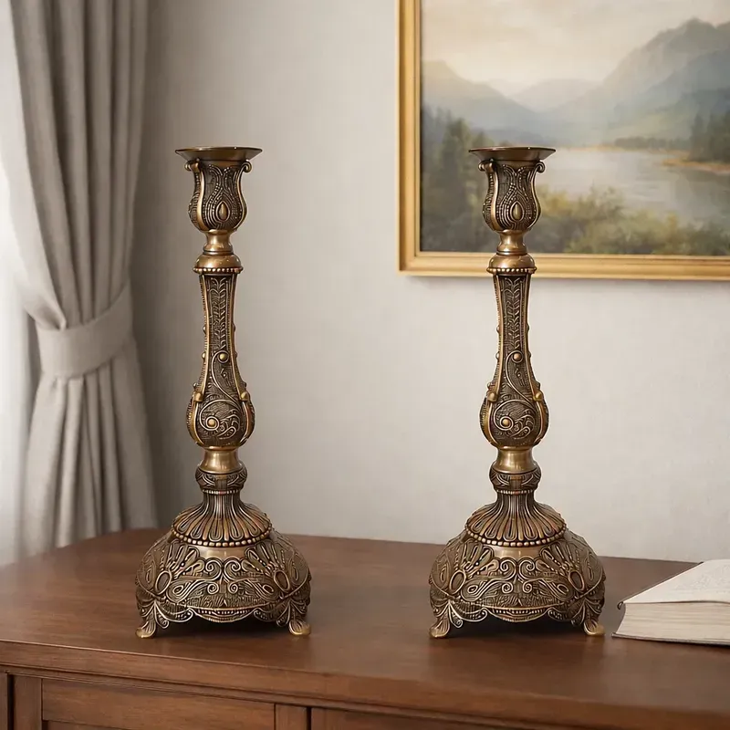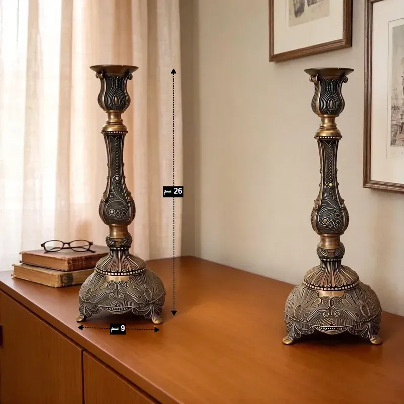 - يأتي باللون النحاسي المعتق (Antique Brass) الذي يمنحه طابعاً أثرياً فخماً. يتميز الهيكل بزخارف هندسية ونباتية دقيقة محفورة ببراعة على طول العمود والقاعدة.