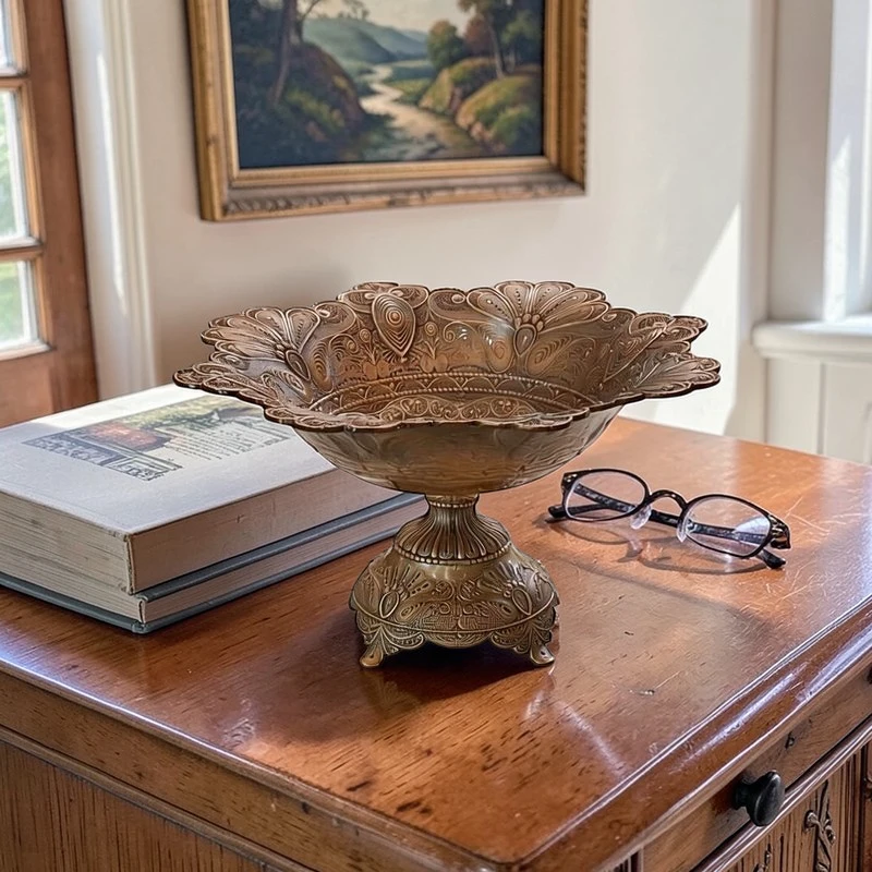 - مصنوع من معادن عالية الجودة مطلية باللون النحاسي المعتق، مما يمنحه متانة وشكلاً جذاباً يدوم طويلاً.