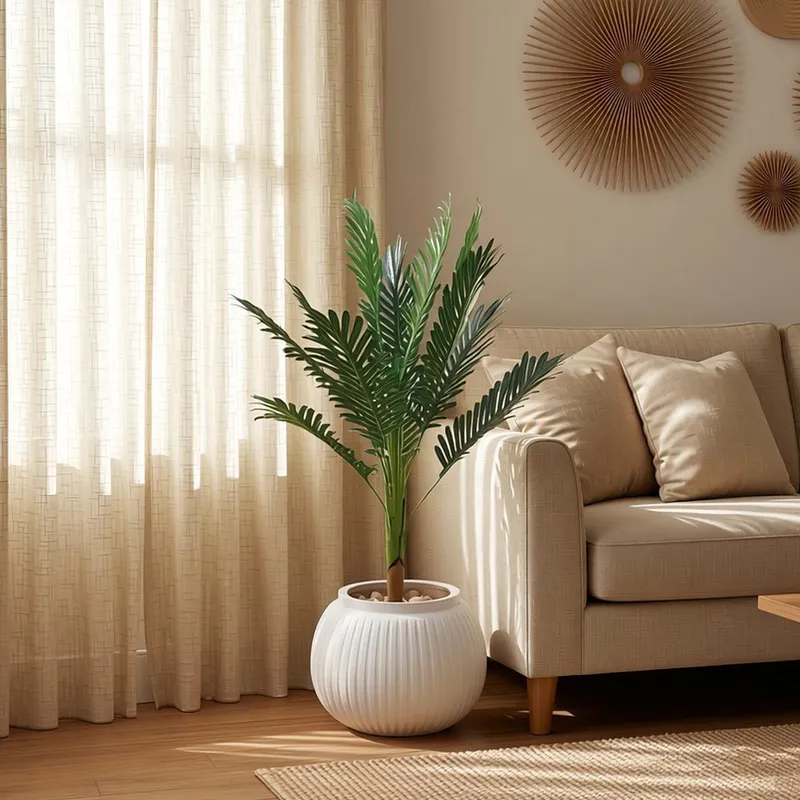 شجرة نخلة صناعية خضراء في أصيص أبيض مضلع بجانب أريكة بيج وإضاءة طبيعية.