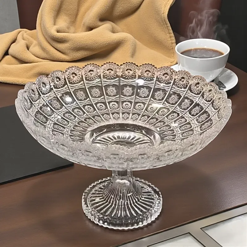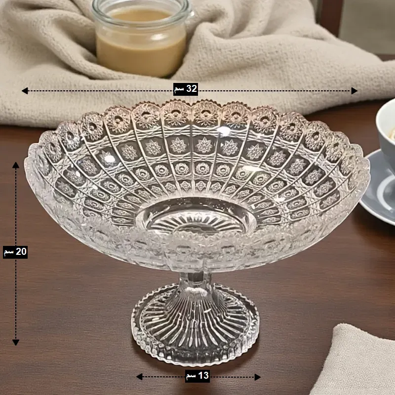 - نقدم لك طبق الفواكه الكريستالي الفاخر هذا، الذي يعكس حرفية صناعة الزجاج الراقية.