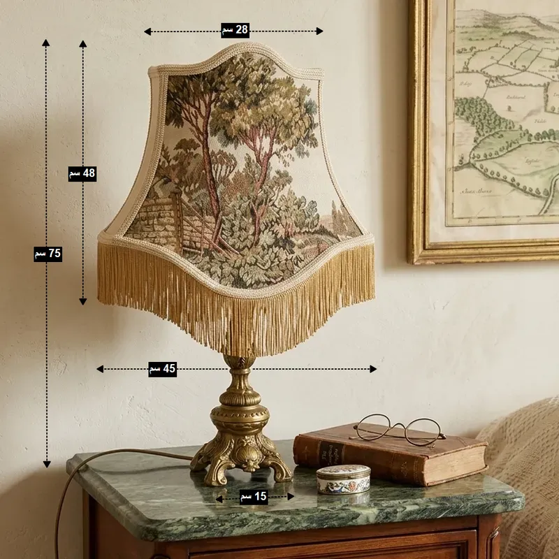 • تتميز الأباجورة بتصميمها الكلاسيكي الأنيق، مع قاعدة نحاسية صلبة وقبعة (شابوه) من الجوبلان ذات نقشات مبتكرة.