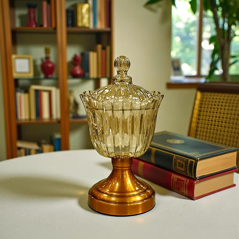 - تتكون من قاعدة معدنية نحاسية اللون، لامعة ومشكلة بطريقة جذابة، وجسم كريستالي يتميز بتصميم منقوش بأضلاع طولية تعطيها مظهراً مميزاً. أما الغطاء فهو مصمم بشكل مستدير ومتناسق مع شكل الجسم.