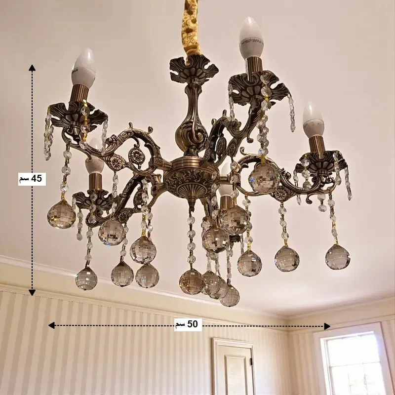 - تصميم يتميز ب 5 أذرع منحنية ومفصلة بشكل فني، مع قواعد المصابيح على هيئة شموع، مما يضفي لمسة ملكية خالدة.