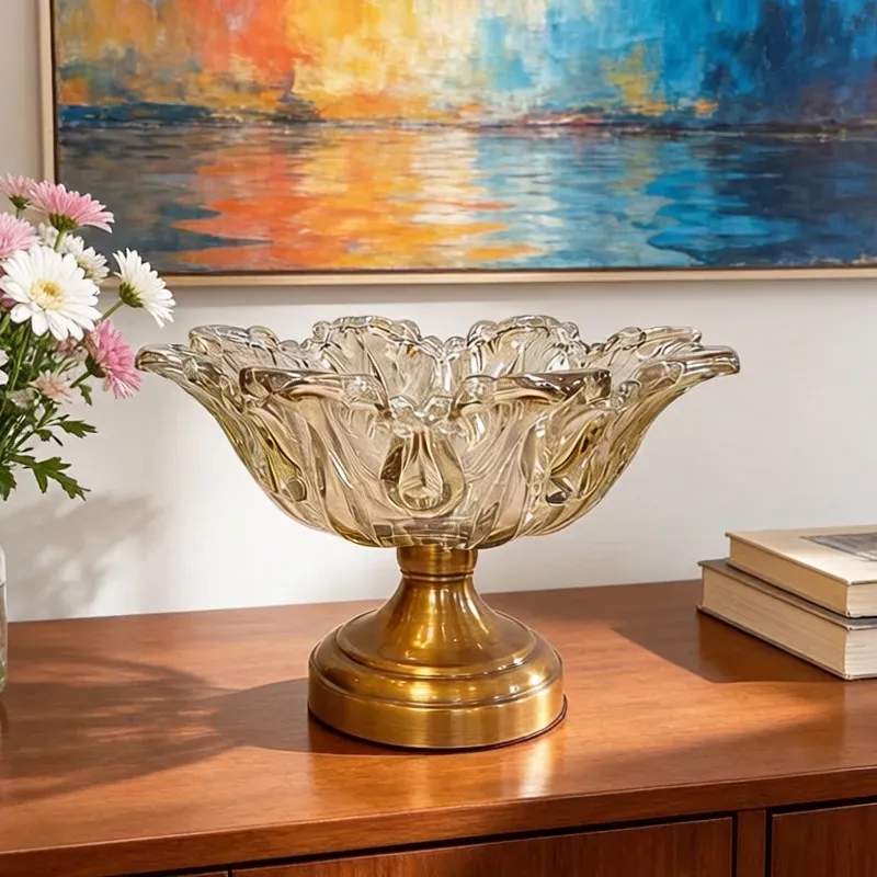 • طبق تقديم فاكهة زجاجي كريستالي عسلي فاخر على قاعدة معدنية ذهبية مصقولة.
