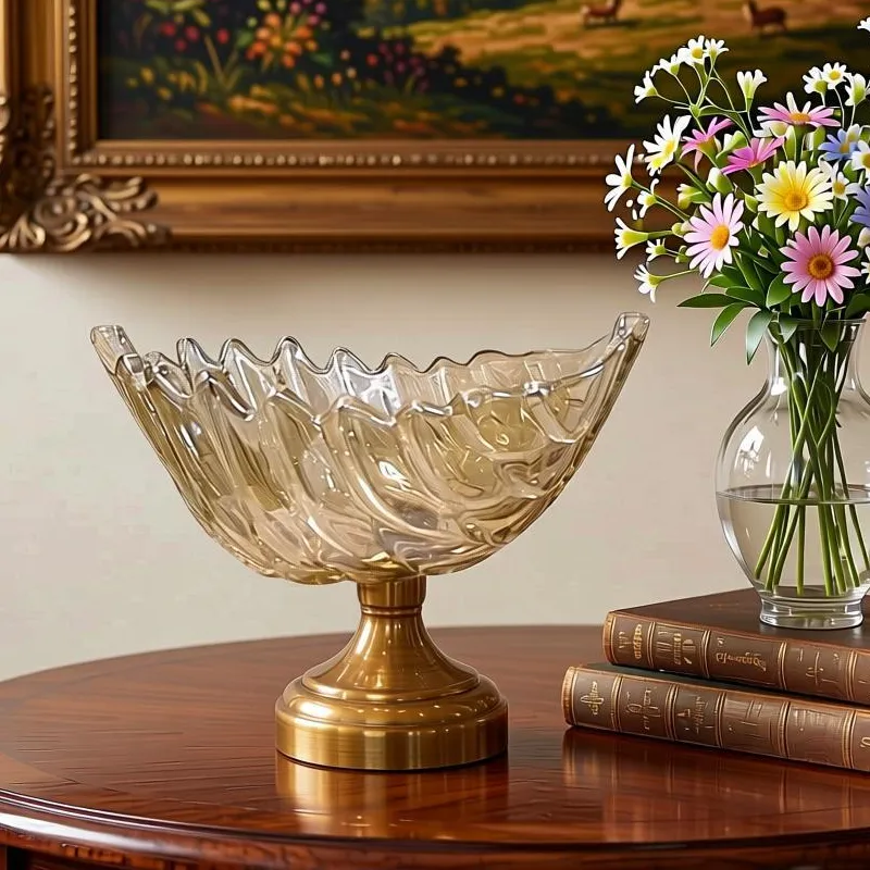 جردينيرة تقديم فاكهة زجاج كريستال بلون دافئ وقاعدة معدنية ذهبية معروضة على ترابيزة خشبية.