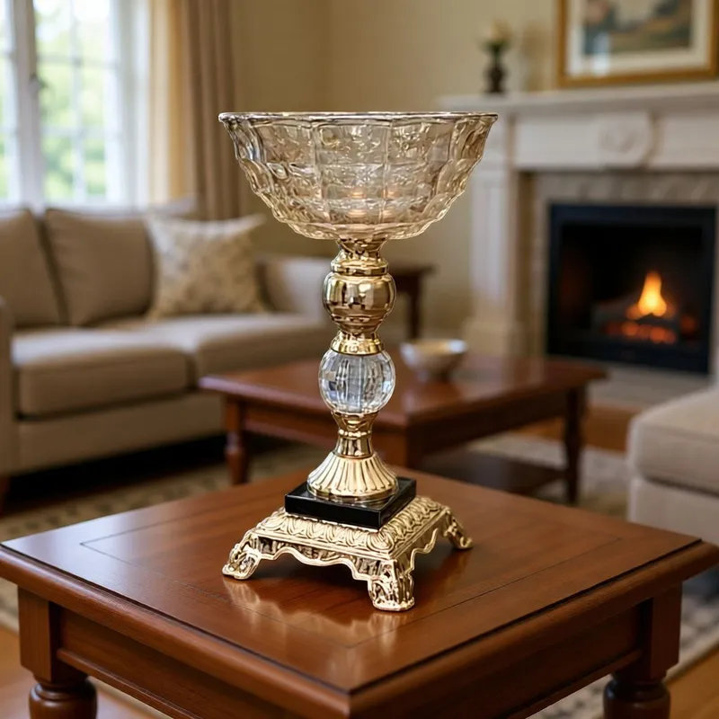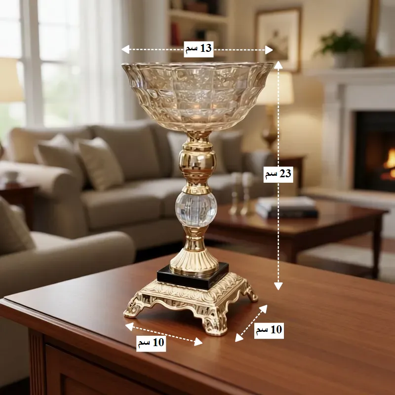 - هذا التصميم ليس مجرد حامل شموع، بل هو قطعة مركزية تجمع بين جمال الكريستال ودفء اللون الذهبي والبرونزي.