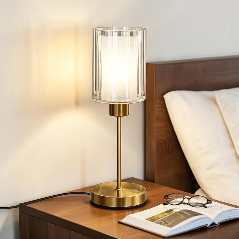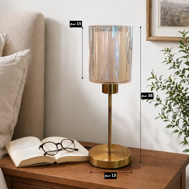أباجورة مودرن بكلوب زجاجي أسطواني وقاعدة ذهبية فاخرة، تصميم عصري أنيق، موديل 030946