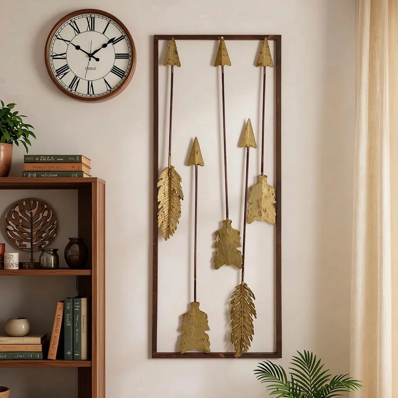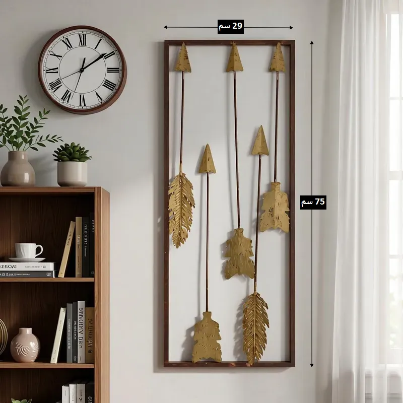 - الألوان الظاهرة: تدرجات اللون الذهبي النحاسي (العتيق) للأسهم والريش، مدمجة ببراعة مع إطار باللون البني الداكن، مما يسهل تنسيقها مع ألوان الأثاث والحوائط المختلفة.