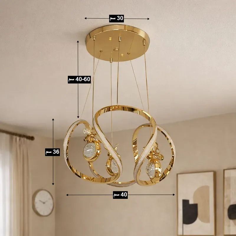 - تتميز بهيكل ذهبي لامع يحمل في طياته كرات كريستالية مضيئة تتداخل بشكل هندسي رائع، مع لمسات كريستالية تعكس الضوء بجمالية فائقة.
