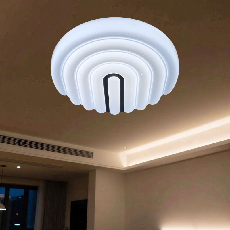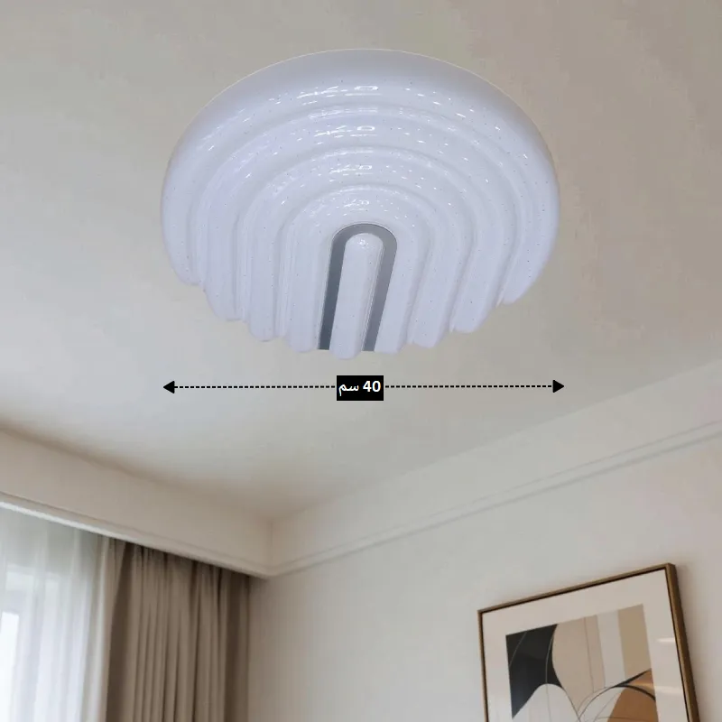 - تصميم متدرج ومبتكر: الطبقات المتداخلة تعمل على تشتيت الضوء بطريقة فنية تمنع الظلال الحادة وتخلق وهجاً ناعماً في السقف.