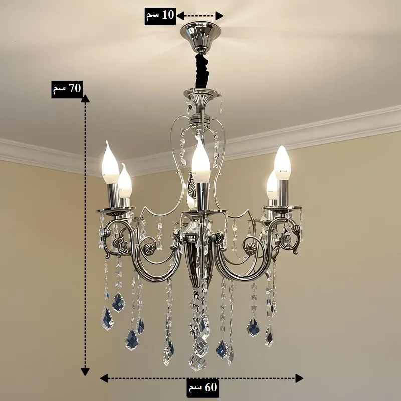 - عدد اللمبات: 6 لمبات (قلاووظ رفيع E14) تتيح لك اختيار درجة لون الإضاءة (أبيض أو ورم) وكثافتها حسب رغبتك.