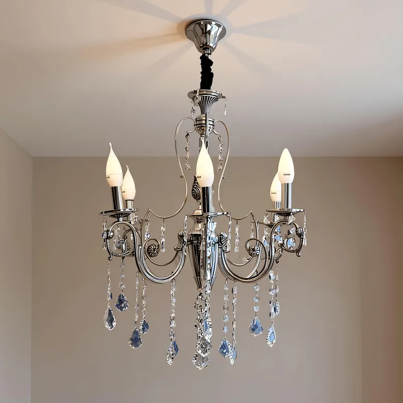 - هذا الموديل صُمم خصيصاً لعشاق التفاصيل الدقيقة، حيث يتميز بهيكل معدني مطلي بطبقة من الكروم الفضي ومعالج يدوياً بلمسات “الباتين” (التعتيق)، مما يبرز المنحنيات والنقوش الكلاسيكية على الأذرع والجسم المركزى للنجفة.