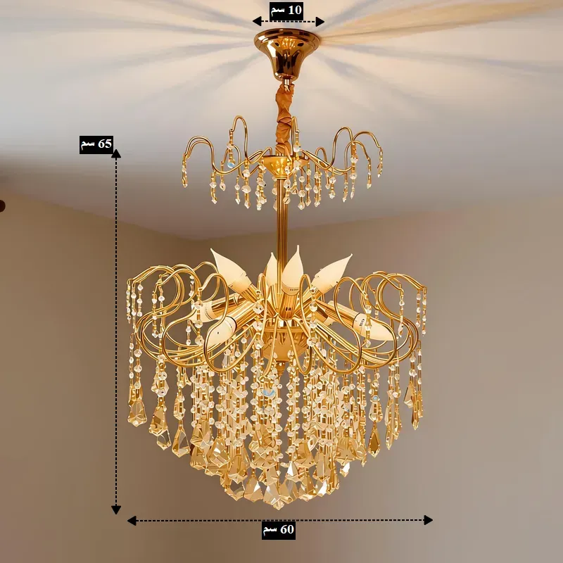 - العرض الكلي للنجفة 60 سم، بينما يصل الارتفاع إلى 65 سم من السقف وحتى نهاية الكريستال.