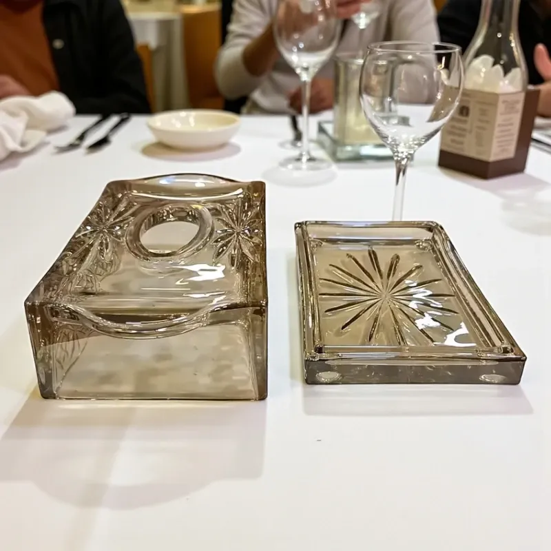 • صُنعت هذه العلبة من كريستال زجاجي عسلي ثقيل وعالي الجودة بلون عسلي هادئ، مما يمنحها بريقًا آسرًا يعكس الضوء بطريقة ساحرة.