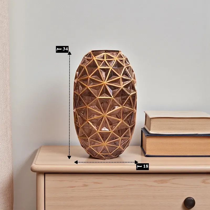 فازة زجاجية هندسية فاخرة – رمادي مطعم بالذهبي – ارتفاع 34 سم، موديل 030488