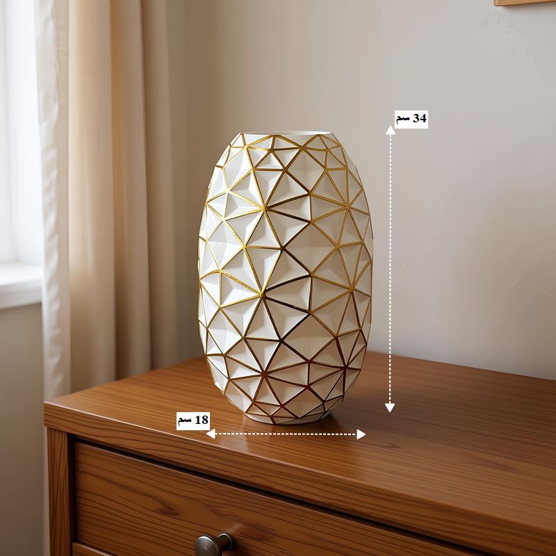 - تأتي هذه الفازة لتكون العنصر المكمل لأناقة منزلك، حيث تتميز بتصميمها البيضاوي المتناسق وسطحها المزين بنقوش هندسية ثلاثية الأبعاد.