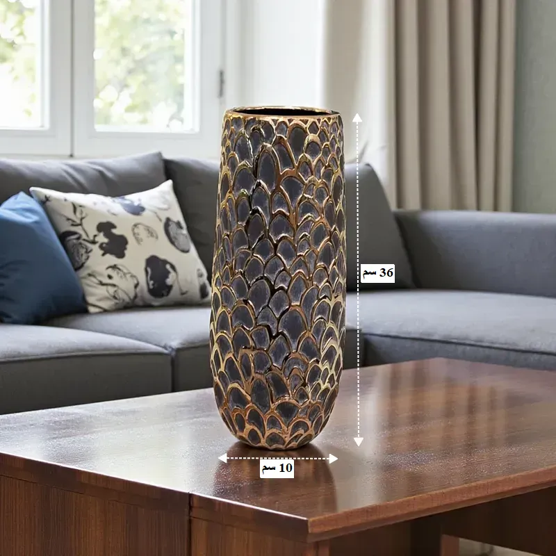 فازة سيراميك فاخرة بنقوش ذهبية بارزة – قطعة ديكور ملكية بارتفاع 36 سم، موديل 030530