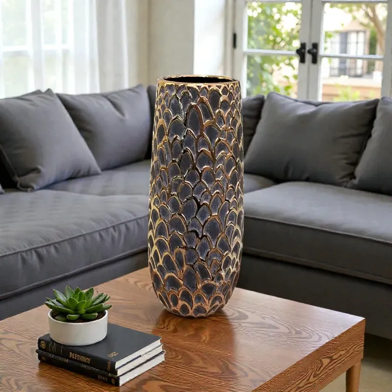 • أضيفي فخامة استثنائية لمنزلك مع هذه الفازة السيراميك المصممة بنقوش “قشور السمك” البارزة والمطليّة بالذهب.