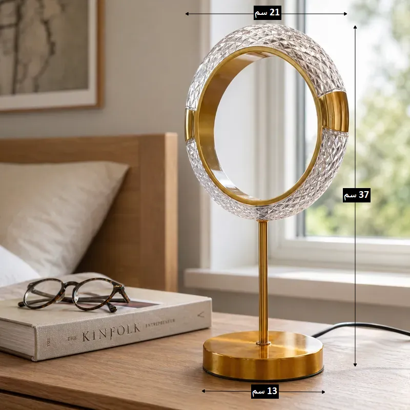 - تأتي الأباجورة بارتفاع إجمالي يبلغ 37 سم، وتتميز بحلقة إضاءة بقطر 21 سم مستقرة على قاعدة ذهبية بقطر 13 سم.