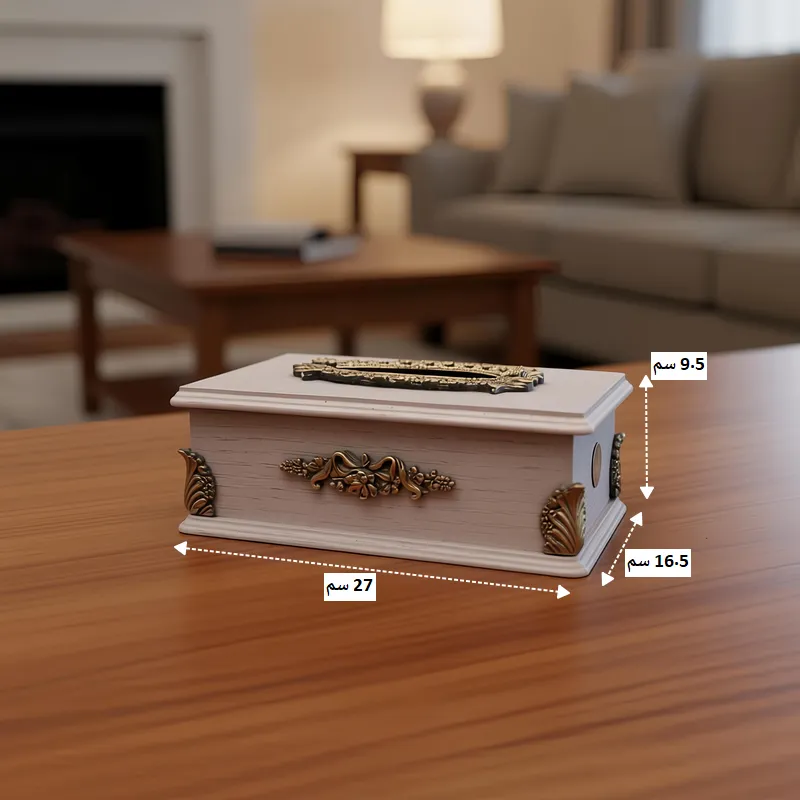 - علبة المناديل: طول 27 سم × عرض 16.5 سم × ارتفاع 9.5 سم.