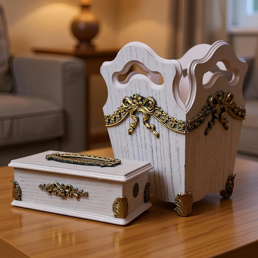 - أرجل ثابتة ومزخرفة: السلة والعلبة مزودتان بأرجل ذهبية متينة ترفعهما عن الأرض والأسطح، مما يحميهما ويزيد من فخامتهما.