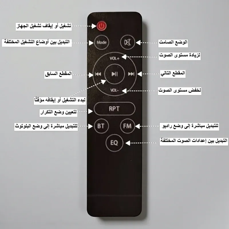 • تحكم شامل: يأتي الجهاز مزودًا بجهاز تحكم عن بعد (ريموت كنترول) يتيح لك التبديل السريع بين البلوتوث والراديو، والتحكم في مستوى الصوت، والمقاطع، وإعدادات الصوت (EQ) بكل سهولة وراحة.