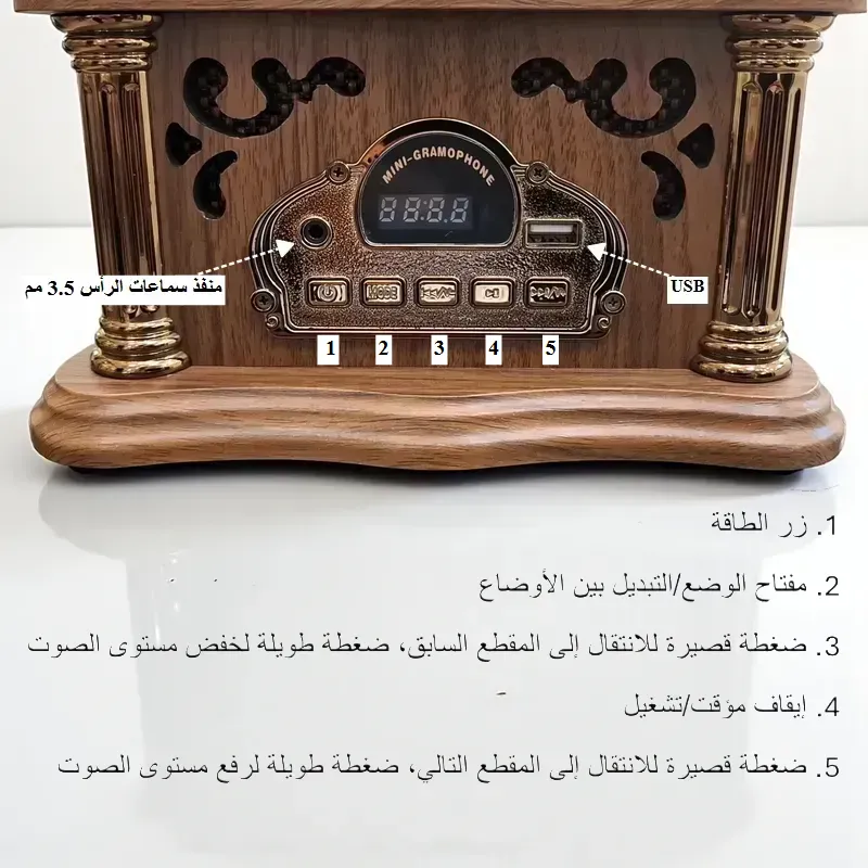 • اكتشف مزيجاً ساحراً من الأصالة والتكنولوجيا الحديثة مع الجراموفون المصغر الأنيق.