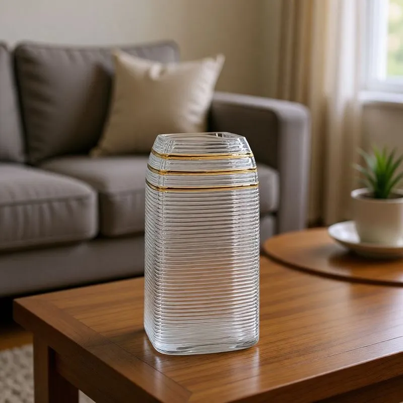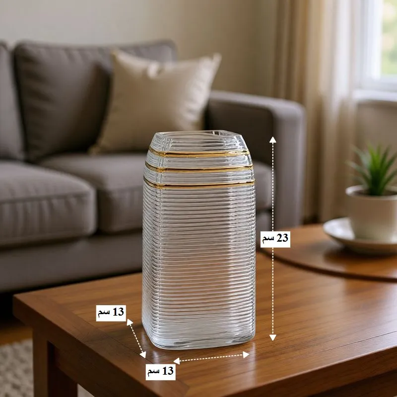 فازة زجاجية مستطيلة بنقش أفقي وحواف ذهبية، موديل 030146
