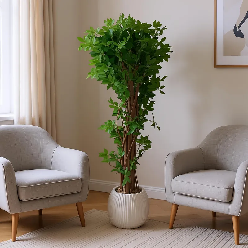 شجرة شفليرا خضراء صناعية كبيرة بارتفاع 170 سم في غرفة معيشة مودرن بين أريكتين