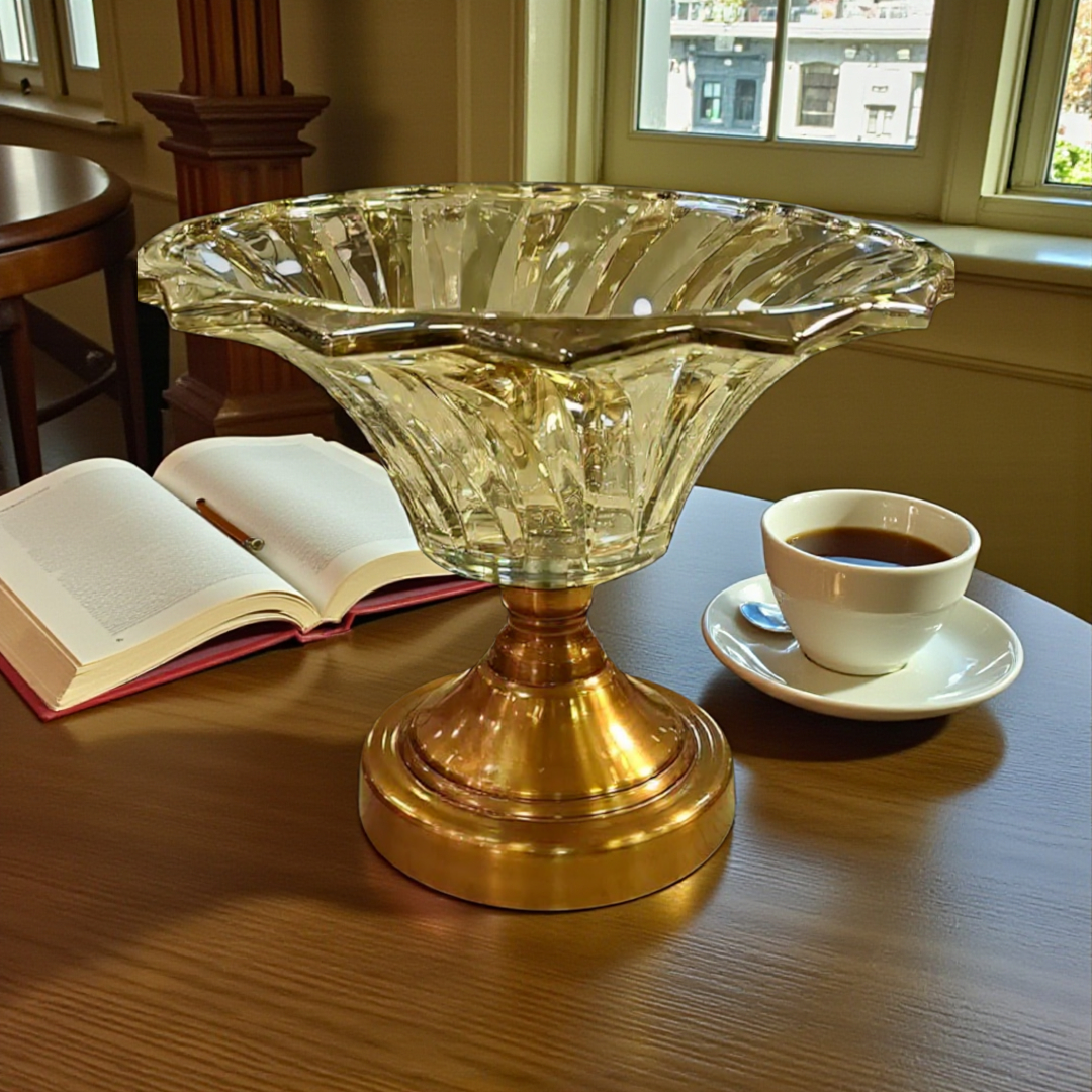 - قاعدة ذهبية ثابتة: القاعدة العريضة (16 سم) تضمن عدم ميلان الطبق رغم اتساع قطره العلوي، وهي مطلية بطبقة تحافظ على لمعانها.