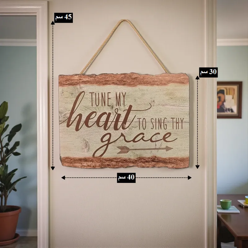 - تتميز اللوحة بطباعة عالية الجودة لعبارة “TUNE MY HEART TO SING THY GRACE” بخط أنيق وجذاب مع رمز سهم، وذلك على خلفية خشبية ذات ملمس عتيق، وتفاصيل محروقة باللون البني المحمر على الأطراف.