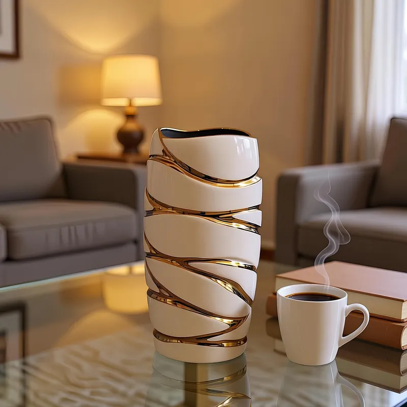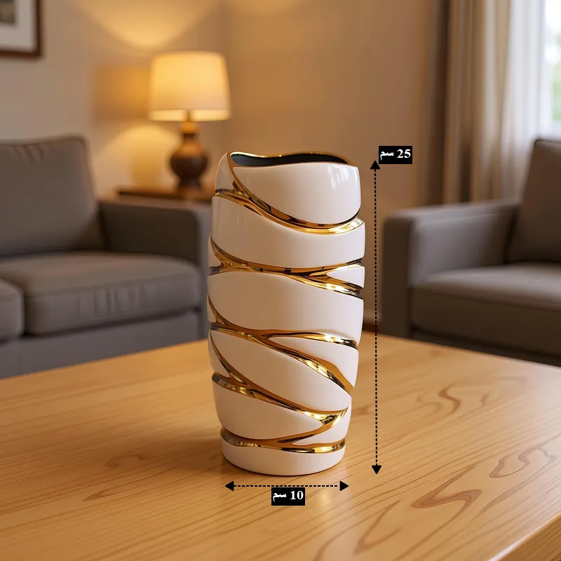 - تُعد هذه الفازة تجسيداً للأناقة المعاصرة، حيث يبرز بريق البورسلين الأبيض المزين بتموجات ذهبية محفورة تضفي عمقاً وتأثيراً بصرياً مذهلاً في غرف المعيشة أو المكاتب.