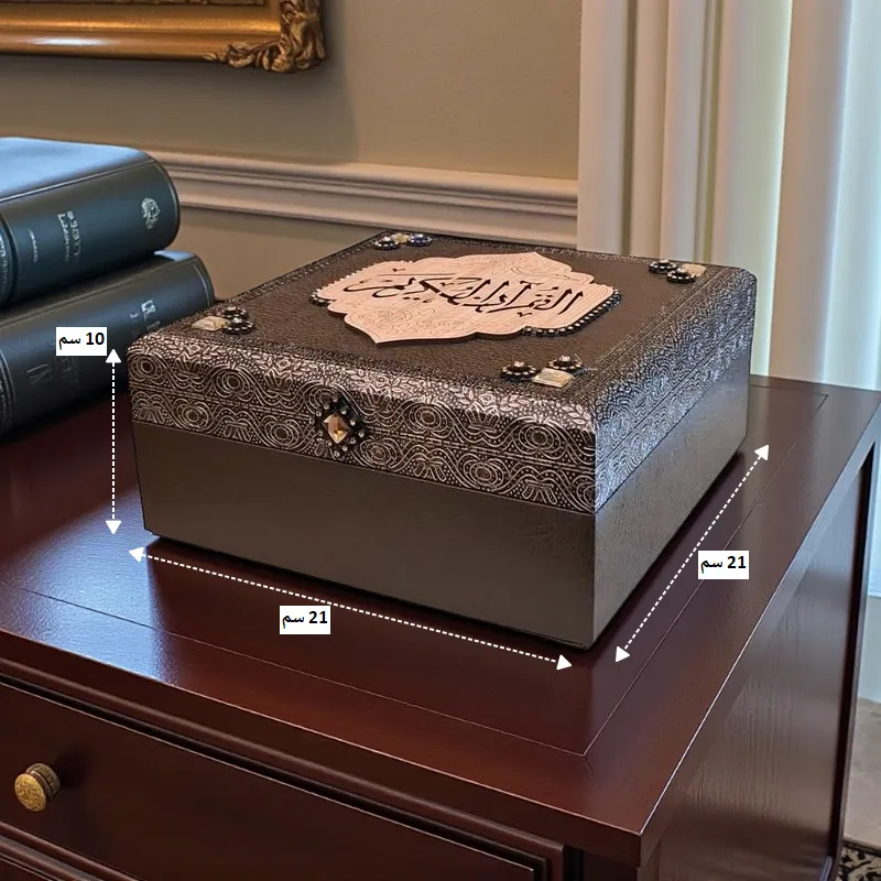 • طقم إهداء فاخر يتكون من صندوق خشبي مزخرف، مصحف شريف بغطاء جلد متناسق، وسبحة أنيقة.